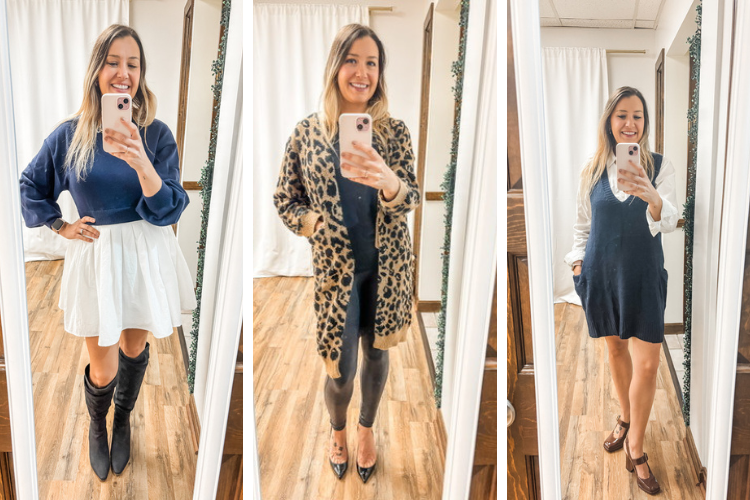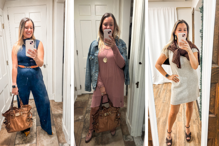 This navy jumpsuit has been my shining star lately, and I have gotten so many questions asked every time I wear it (you won’t believe the price on Amazon!). Look 2 is an old, pink American Eagle sweater dress that proves shopping in your closet is the best way – and I LOVE the ruffle trim! Outfit 3 is one of my got- sweater dresses and it’s from Target.