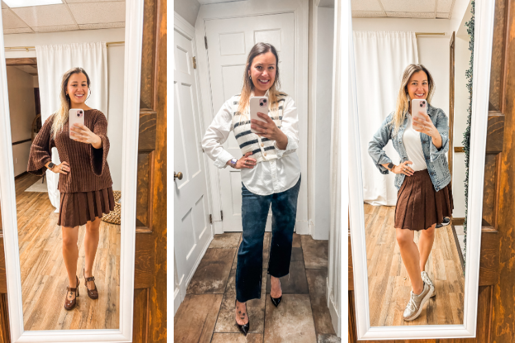 Outfit one can easily have a button-down added underneath the vest for colder days and the pull-on wide-leg pants are so comfortable! You will recognize the striped skirt from an earlier look – I love to mix and match sets. And look 3 is the perfect fall transition whenever we have chilly mornings, but then 75-degree afternoons.